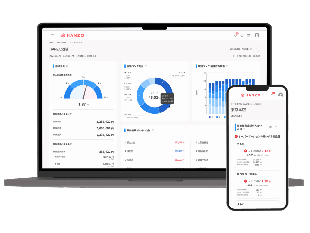 「HANZO 原価分析」は食材別の仕入れ・標準原価、棚卸、標準原価を設定したメニューレシピ、販売管理等のデータを自動連携・集計し、店舗・食材ごとに理論原価と実原価の差分を可視化します。差異と課題箇所を明らかにすることで、原価改善に向けた方針策定を可能にします。